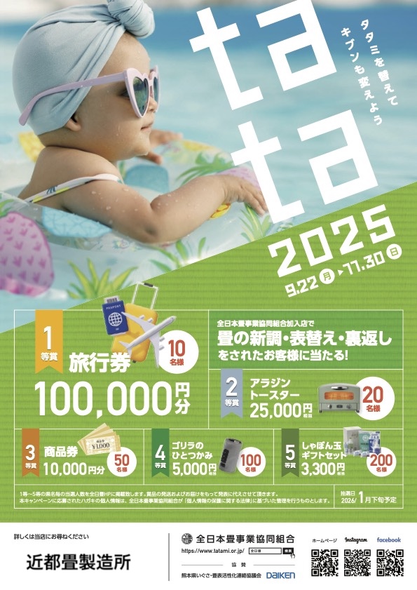 キャンペーン期間中、全日畳加入店(当店)にて5万円以上の畳替え(裏返し・表替え・新畳工事)をされたお客様に応募抽選ハガキをプレゼント!