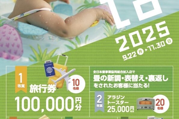 イベント 今年も始まりました!tata 2025 全日本畳事業協同組合が贈る畳替えキャンペーン!tata2025が今年も始まりました!キャンペーン期間中、全日畳加入店(当店)にて5万円以上の畳替え(裏返し・表替え・新畳工事)をされたお客様に応募抽選ハガキをプレゼント!1等 旅行券 10万円... 2025.09.26 イベント
